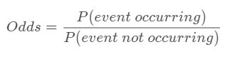 로지스틱 회귀의 계수는 비선형 함수 내에 있어서 직관적으로 해석하기가 어려운데 오즈(Odds) 를 사용하면 선형결합 형태로 변환 가능해 보다 쉽게 해석이 가능하다. 오즈는 실패확률에 대한 성공확률의 비 인데 예를들어 odds = 2이면 성공확률이 실패확률의 2배라는 뜻이다.